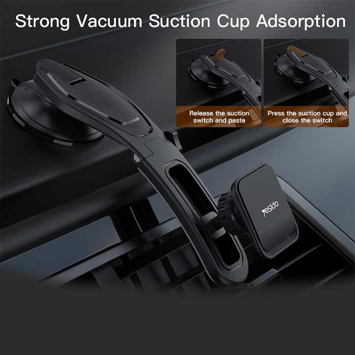 پایه نگهدارنده مگنتی داشبوردی یسیدو مدل C107، ابتدا از یک سمت با استفاده از مگنت، به تلفن همراه شما متصل شده و از سمتی دیگر به داشبورد خودرو وصل میشود. خاصیت آهنربایی این مگنت در حدی است که حتی تکانهای شدیدِ ماشین نیز، نمیتواند باعث افتادن یا آسیبدیدن موبایل شما شود.