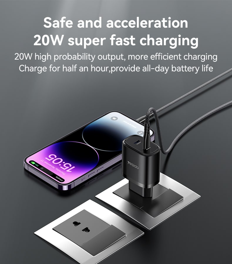 این کلگی یسیدو YESIDO YC54 با توان خروجی 20 واتی فست شارژ از جنس پلاستیک با کیفیت pc ضد شعله و عایق است بسیار در برابر ضربه مقاوم است و طراحی کوچک آن مناسب جابه جایی است. ورودی این شارژر دو شاخه EU سازگار با پریز های ایرانی است. کلگی دارای دو پورت خروجی Type C با توان خروجی 20 وات میتواند دو دستگاه همزمان شارژ کند. این کلگی از جنس PC بازدارنده آتش است و در برابر حرارت مقاوم است و با دمای ثابت دستگاه ما را شارژ میکند و محافظ باطری است. این کلگی یک کابل همراه TypeC/Lightning به طول 1 متر از کنفی مقاوم دارد. این شارژر مناسب انواع گوشی ها و تبلت ها است. این شارژر دیواری مجهز به فناوری PPS PROTOCOL است.